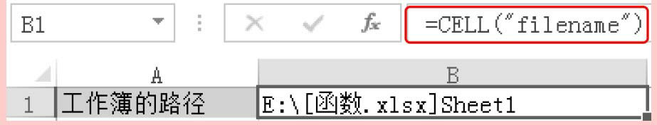 返回指定工作簿的路径,可以利用CELL函数来实现。选中B1单元格,在公式编辑栏中输入公式: