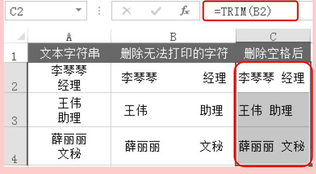 ➋ 将光标移到C2单元格的右下角,待光标变成十字形状后,按住鼠标左键向下拖动进行公式填充,即可将B列文本中的多余空格都删除,如图2所示。