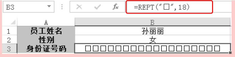 身份证号码有固定的18位号码,手工插入方框符号比较浪费时间,使用REPT函数就可以实现一次性输入指定数量的方框,以便身份证号码的填入。