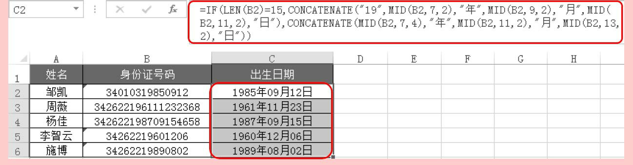 =IF(LEN(B2)=15,CONCATENATE(“19″,MID(B2,7,2),”年”,MID(B2, 9,2),”月”,MID(B2,11,2),”按“Enter”键即可从身份证号码中提取员工“邹凯”的出生日期。