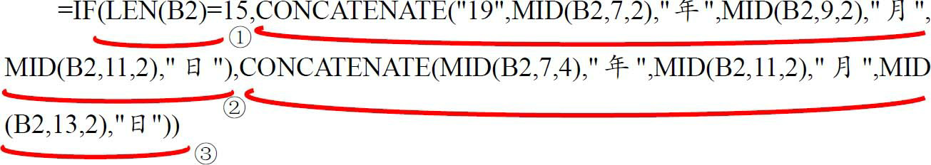 ③ 如果步骤①条件不满足,分3次从B2单元格字符串中提取字符,分别是:第7、8、9、10位(年份);第11、12位(月份);第13、14位(日)。再使用CONCATENATE函数将提取的字符与“年”、“月”、“日”相连接。