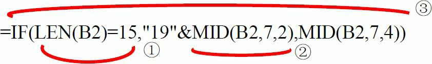 =IF(LEN(B2)=15,”19″&MID(B2,7,2),MID(B2,7,4))