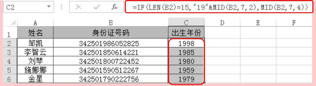 ➋ 将光标移到C2单元格的右下角,待光标变成十字形状后,按住鼠标左键向下拖动进行公式填充,即可从员工身份证号码中提取所有员工的出生年份,如图4所示。