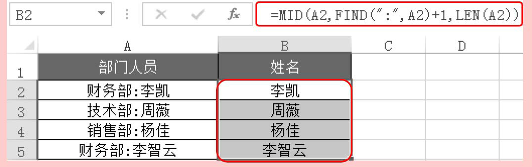 A列为公司部门人员名单,每个单元格中同时包含了部门和员工姓名,并且之间以冒号分割。使用MID函数配合FIND函数可以提取出员工姓名并显示在B列中。