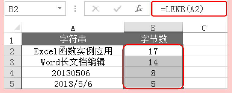 ➋ 将光标移到B2单元格的右下角,待光标变成十字形状后,按住鼠标左键向下拖动进行公式填充,即可返回其他单元格文本所对应的字节数,如图6所示。