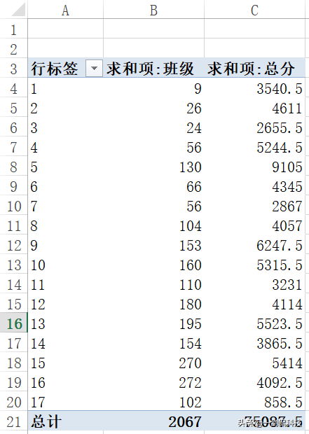 (1)选中数据表中任一单元格,插入数据透视表,在右边的“数据透视表字段”中,将“班级”拖到“行”区域,再将班级、总分依次拖放到“值”区域。得到如下的数据表。