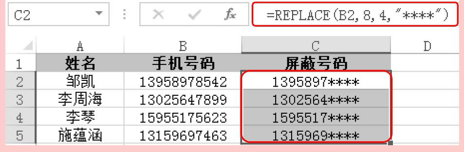 从B2单元格中的第8位开始,将剩下的后四位替换为“****”。