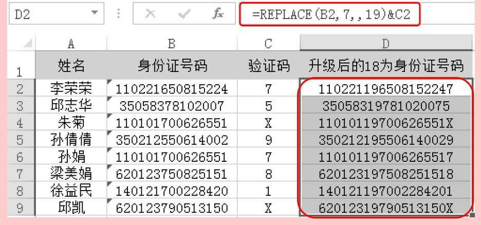在2000年以前的身份证号码为15位,使用REPLACE函数可以把15位身份证号码从第7位开始把字符替换为“19”,然后运用连接运算符把验证码连接起来,完成18位身份证号码的升级设置。