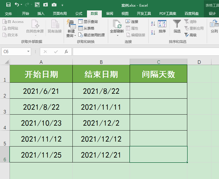 下面我们来看一下应用案例,下图工作表A列和B列中分别为开始日期和结束日期,接下来我们要将每行开始日期和结束日期之间的间隔天数返回在C列中。