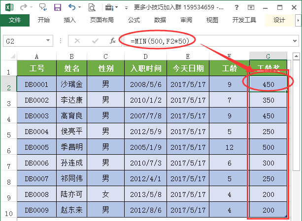3、计算好工龄后,我们就要计算员工的工龄奖。我们现在用MIN()函数来计算这个工龄奖.=MIN(500,F2*50),当工龄小于等于10年时每年加50元,大于10年就封顶500元。
