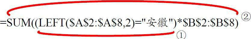 =SUM((LEFT($A$2:$A$8,2)=”安徽”)*$B$2:$B$8)