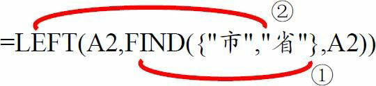 =LEFT(A2,FIND({“市”,”省”},A2))