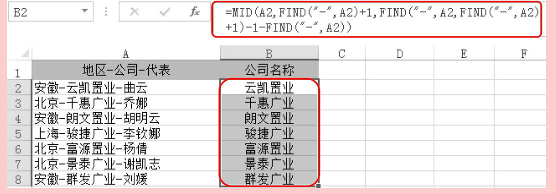 当前数据表的A列中包括地区、公司名称、公司代表姓名。利用MID函数配合FIND函数可以提取出中间的公司名称并显示在B列中。