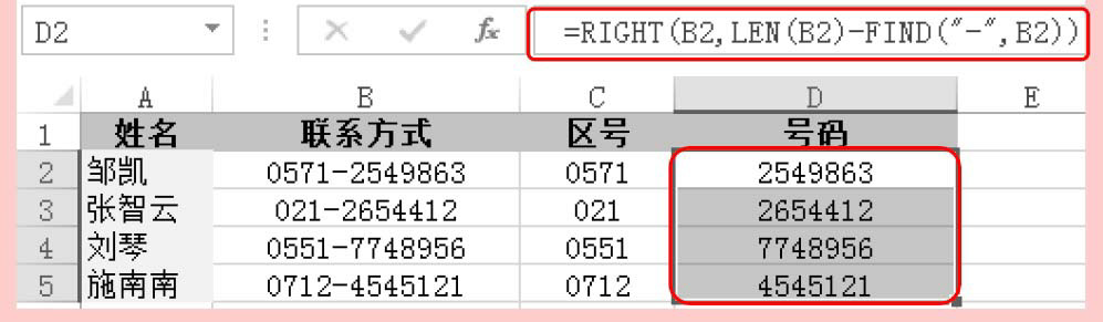 按“Enter”键即可返回区号后的号码。向下复制D2单元格的公式,即可从B列电话号码中提取出号码,如图3所示。