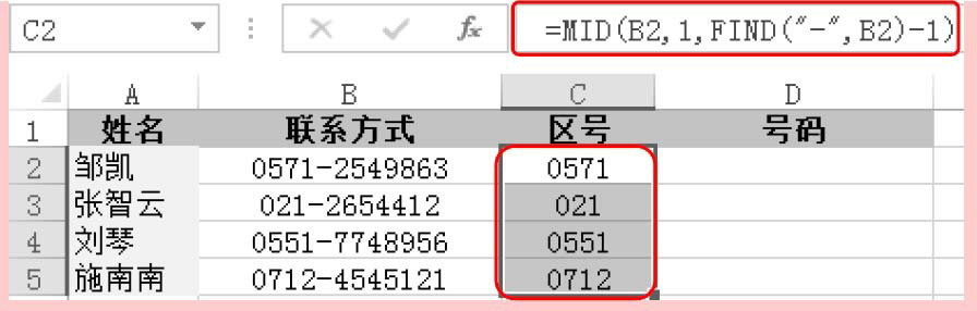 按“Enter”键并向下复制C2单元格的公式,即可从B列的联系方式中提取出区号,如图2所示。