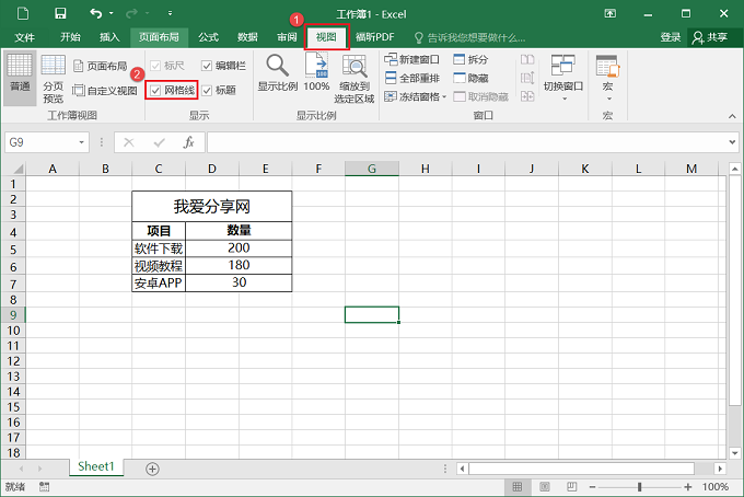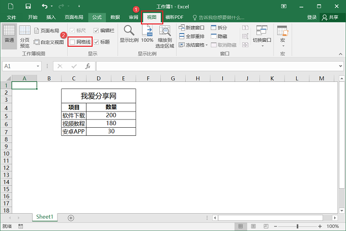 2.在菜单栏中点击【视图】,然后在“显示”选项卡中取消勾选【网格线】,即可看到界面网格线全部消失了