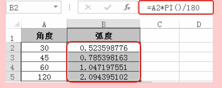 ➋ 将光标移到B2单元格的右下角,待光标变成十字形状后,按住鼠标左键向下拖动进行公式填充,即可计算出其他角度所对应的弧度值,如图3所示。