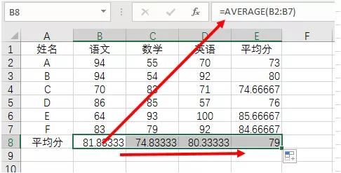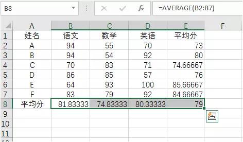 按住CTRL键,同时选中B8:E8和,E2:E7两个区域,然后依次点击公式,自动求和,平均值