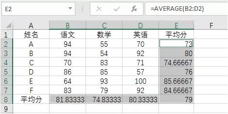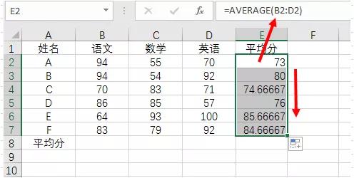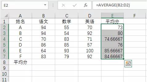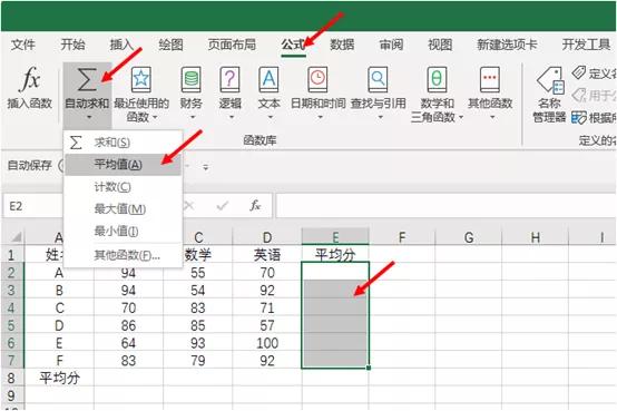 选中E2:E7区域,依次点击公式,自动求和,平均值