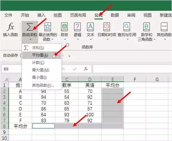 同理: 选中B8:E8区域,依次点击公式,自动求和,平均值