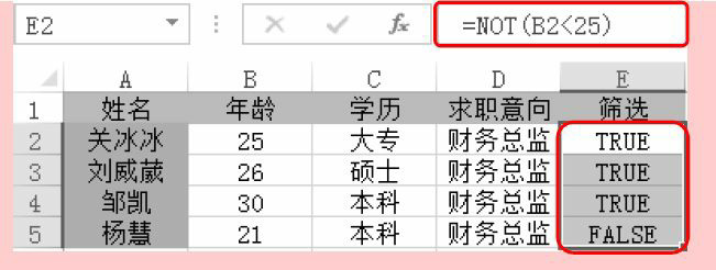 如果需要从招聘名单中筛选出“25岁以下”的应聘人员,可以利用NOT函数来进行判断。