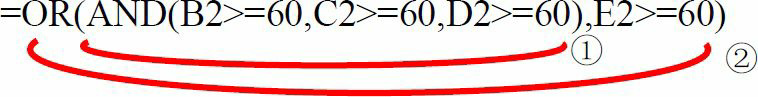 =OR(AND(B2>=60,C2>=60,D2>=60),E2>=60)