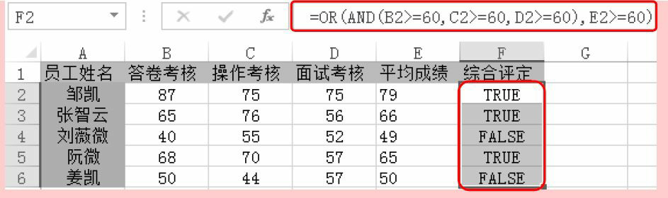 按“Enter”键即可判断出该员工每项技能考核是否有一项没有达到60分,如果有则返回TRUE(没有达标),否则返回FALSE(达标)。