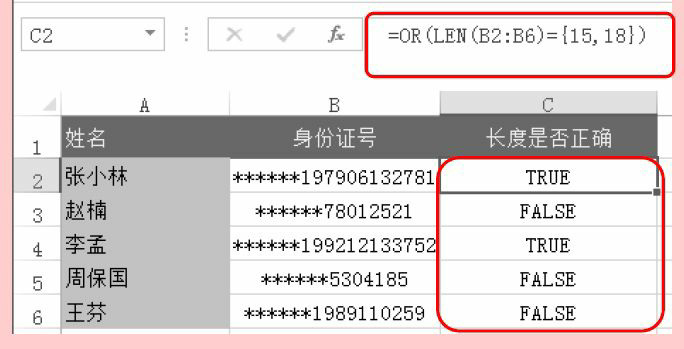 ①使用LEN函数查找B2:B6单元格区域中的字符文本长度是否等于15或者18。