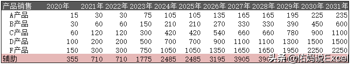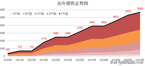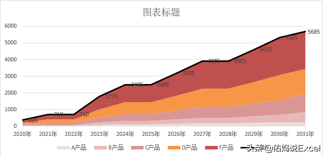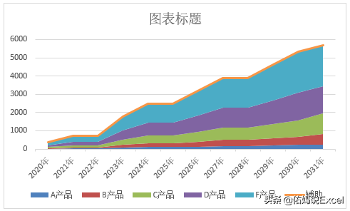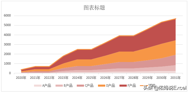 面积图主要用于趋势分析,经常和折线匹配使用,强调数量随时间变化的程度。从上述图表中可以看出从2020年到2031年整体销售趋势是上升的,前几年的增长趋势缓慢,后几年的增长速度加快。同时观察图表进一步可以得出F产品的市场占有率是最大的,增长速度也最快,相对来看A产品和B产品增长缓慢,因此公司后续可考虑加大对F产品和E产品的市场投放量。