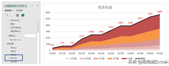 Tips:为了让面积图中的标签显示清晰,单击选中所有数据标签,右击选择【设置数据标签格式】,在右侧对话框中选择【标签选项】→【标签位置】→ 【靠上】,同时修改标签的字体颜色为红色,即完成标签设置,最终效果如右下图所示。