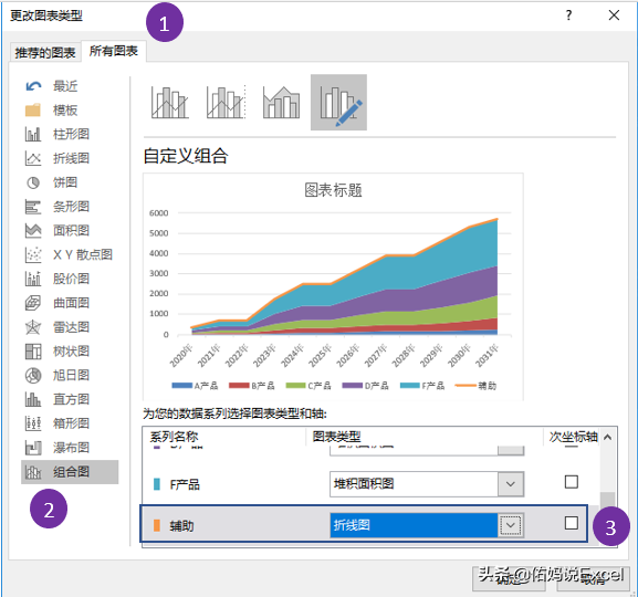 ❸选中”辅助”数据系列并右击,选择【更改系列图表类型】,弹出【更改图表类型】对话框,将”辅助”数据系列的【图表类型】设置为【折线图】,如下图所示。