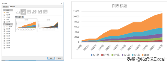 ➋ 弹出【插入图表】对话框。进一步选择【所有图表】→【面积图】→【堆积面积图】,点击确定,如左下图所示。最终生成面积图效果如右下图所示。