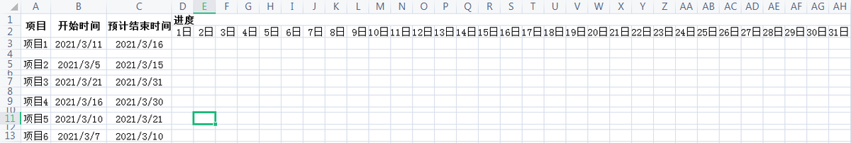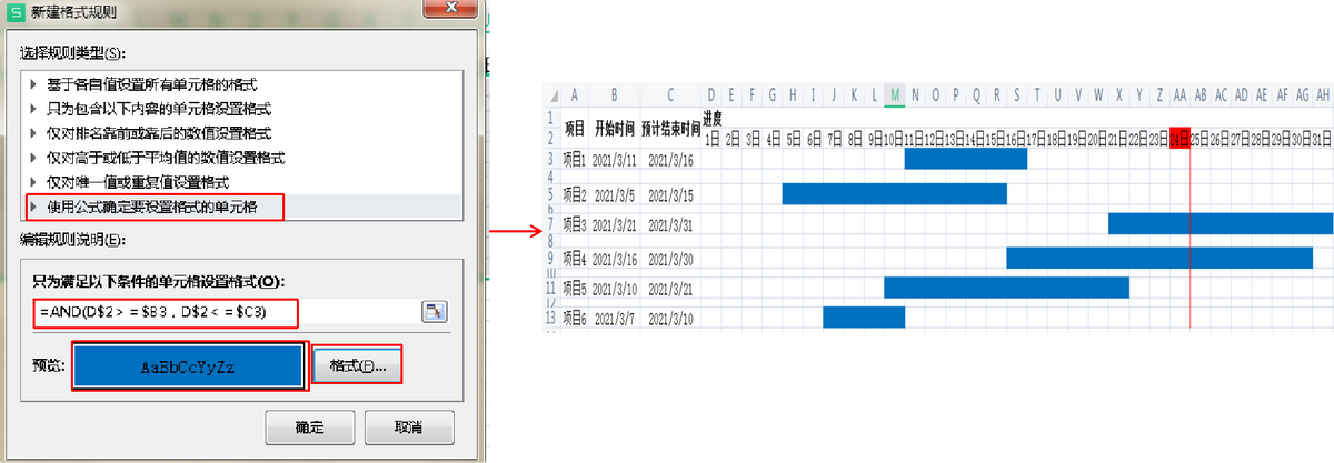 选中D3:AH13,所有区域,单击“开始”菜单,选择条件格式—新建规则,选择“使用公式确定要设置格式的单元格”,输入公式“=AND(D$2>=$B3,D$2<=$C3),”格式选择“图案”,填充为“蓝色”。