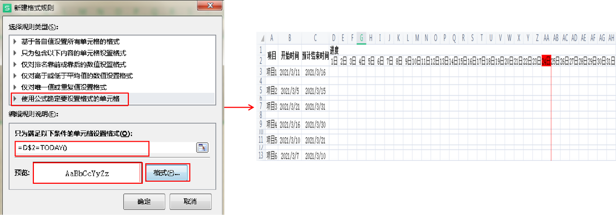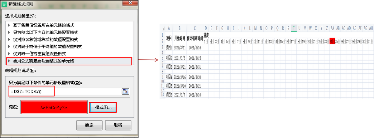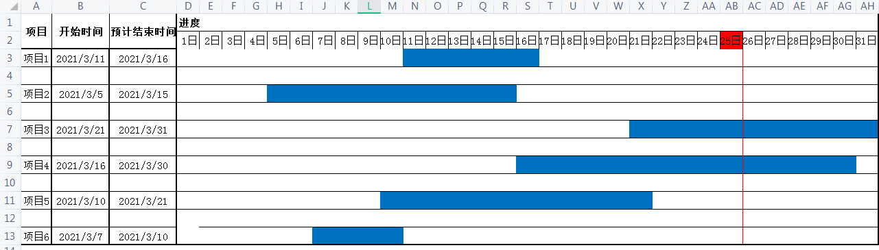 选中D3:AH13,所有区域,单击“开始”菜单,选择条件格式—新建规则,选择“使用公式确定要设置格式的单元格,输入公式“=D$2=TODAY()”,格式选择“边框”填充为红色,“竖边框”。