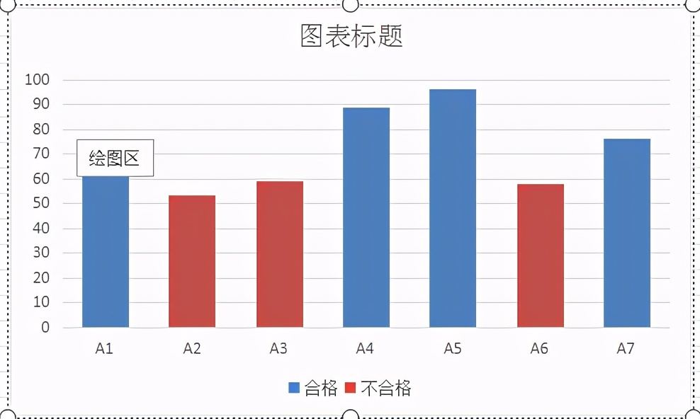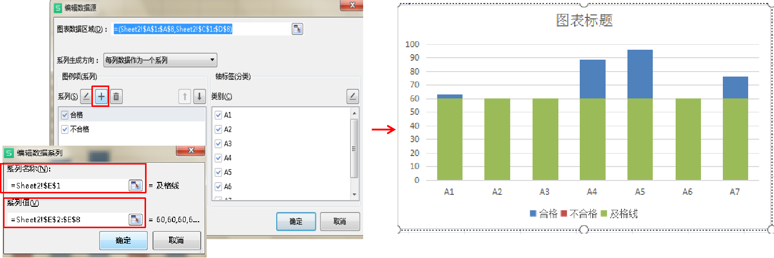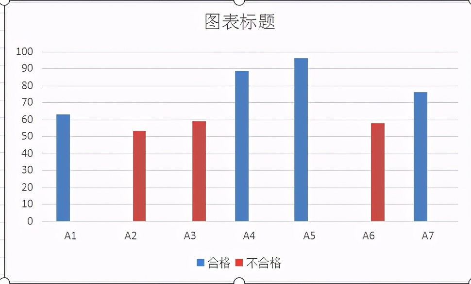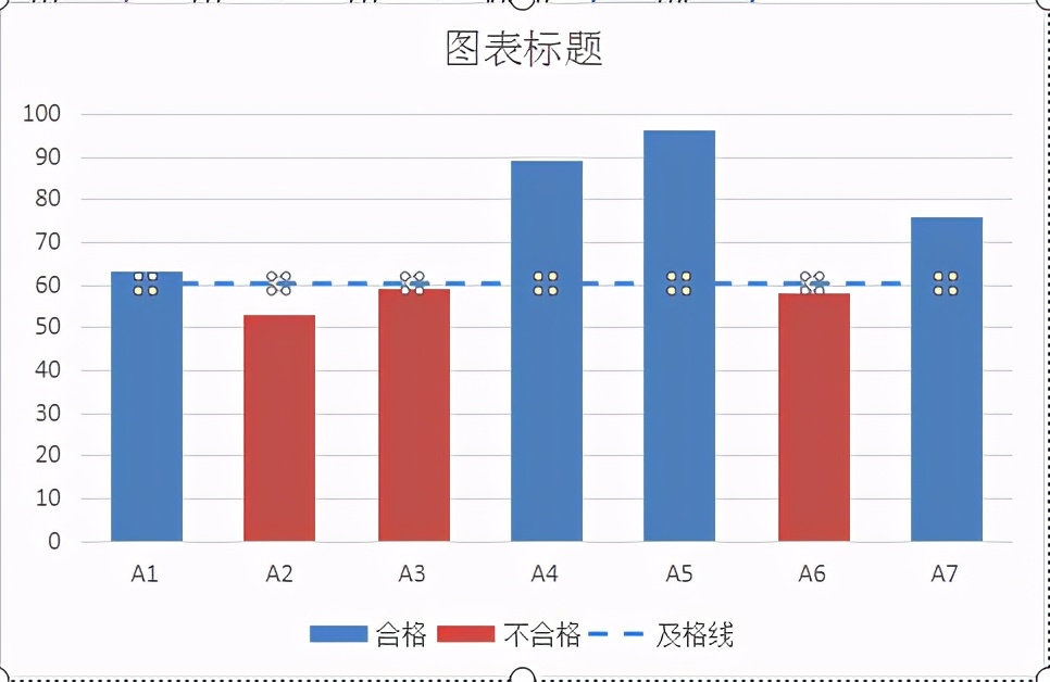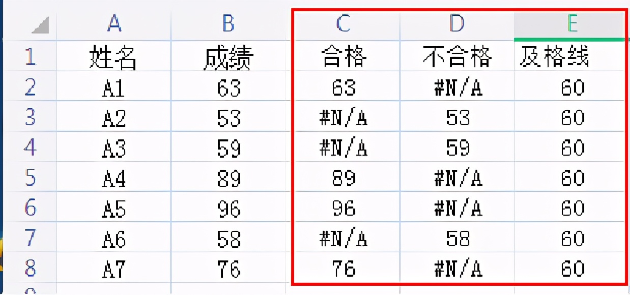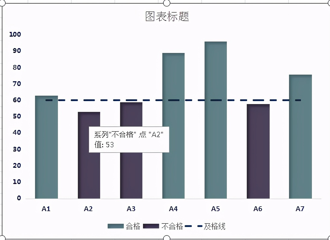 在原有数据基础上添加辅助列:”合格”,设置公式:=IF(B2>=60,B2,NA());”不合格”,设置公式”=IF(B2<60,B2,NA())”;”及格线”,输入数值”60″。