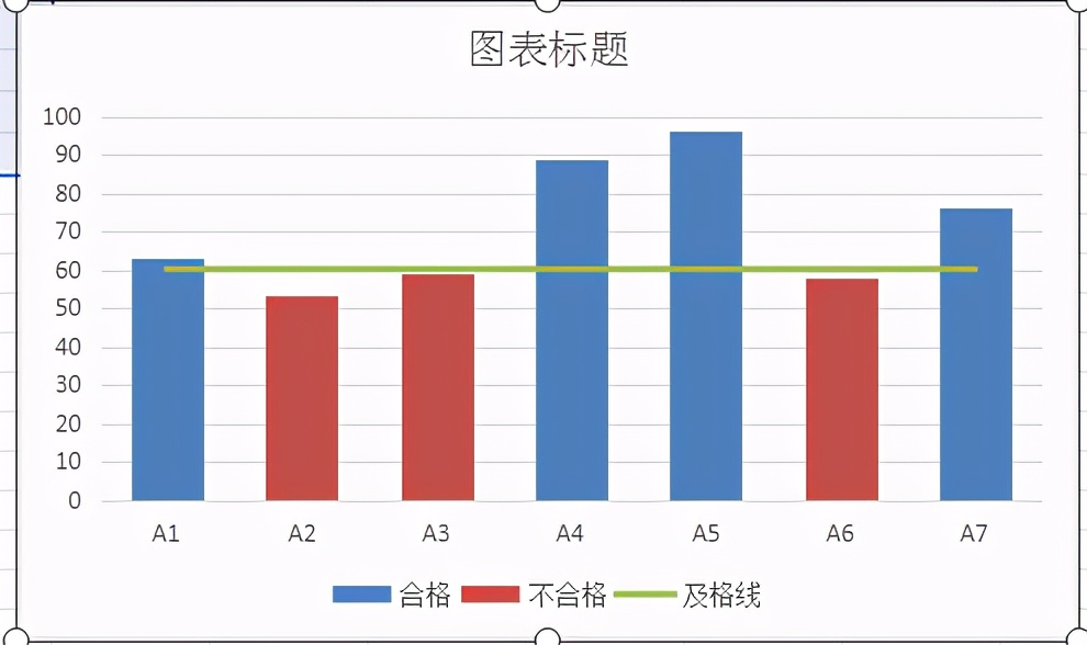 选中图表中任一系列,右键选择数据,添加系列,系列名称—”及格线”,系列值—”及格线”所在列的数据。