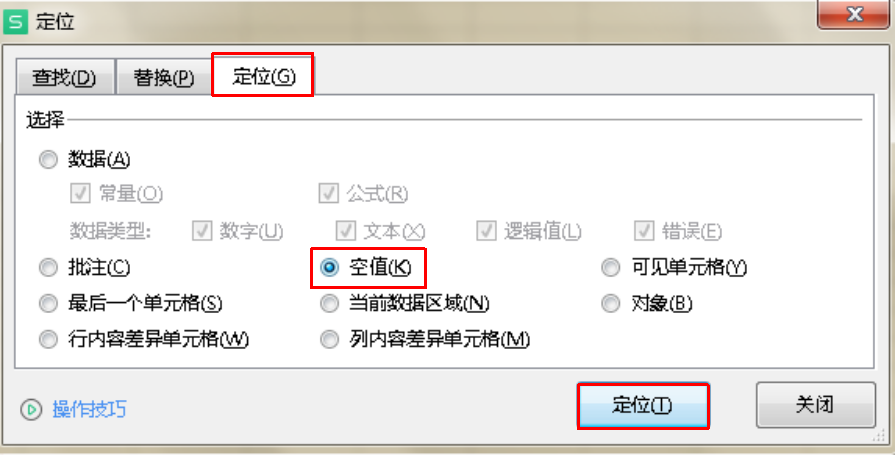 选中整个工作表区域,快捷键“Ctrl+G”,打开定位对话框,选择”空值”,定位。