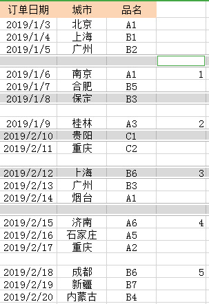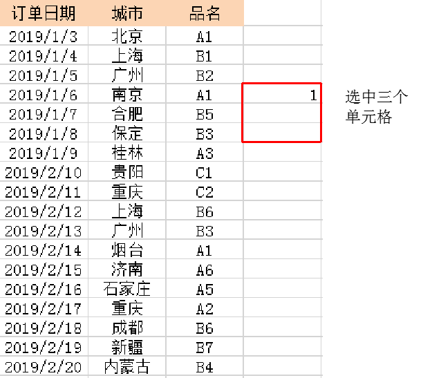 首先在第四行输入数字”1″,以”1″为起点,向下选中三个单元格,如图所示。