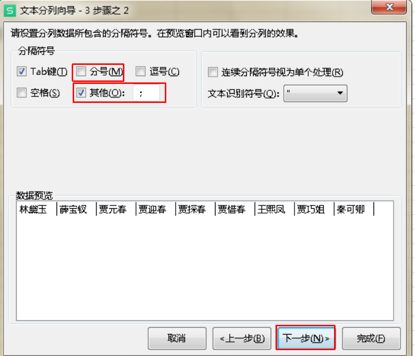 第三去除分号前面”√”,在其他输入”;”下一步。