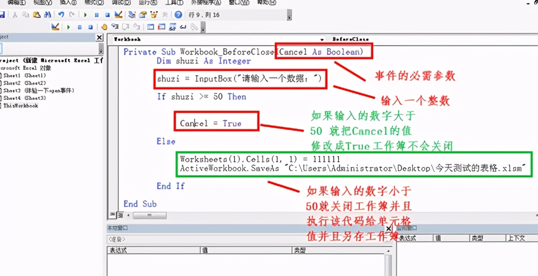 我这个例子就是需要自己输入一个数字如果数字大于50就不会关闭工作簿,如果小于50 就会给单元格一个值,并且关闭工作薄把工作薄另存