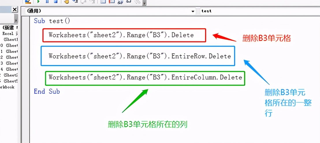 Worksheets(“sheet2”).Range(“B3”).EntireColumn.Delete