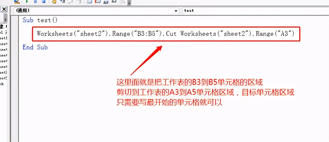 Worksheets(“sheet2”).Range(“B3:B5”).Cut Worksheets(“sheet2”).Range(“A3”)
