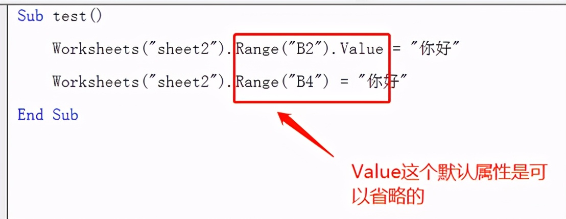 Worksheets(“sheet2”).Range(“B2”).Value = “你好”