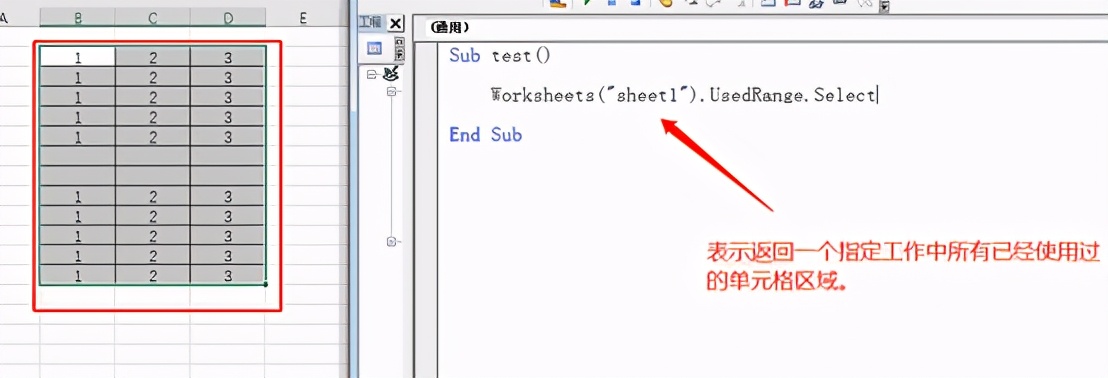 如果说想要选中空格一下的数据怎么办,这里面给大家介绍一个Worksheet对象中的一个属性UsedRange的使用就可以解决。