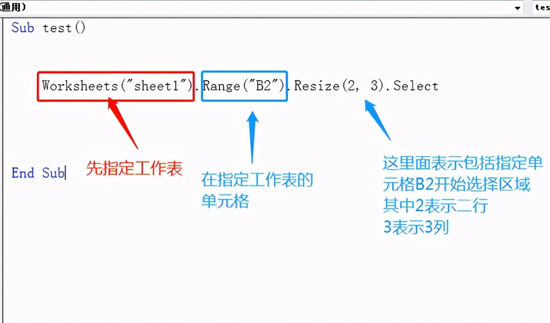 Worksheets(“sheet1”).Range(“B2”).Resize(2, 3).Select
