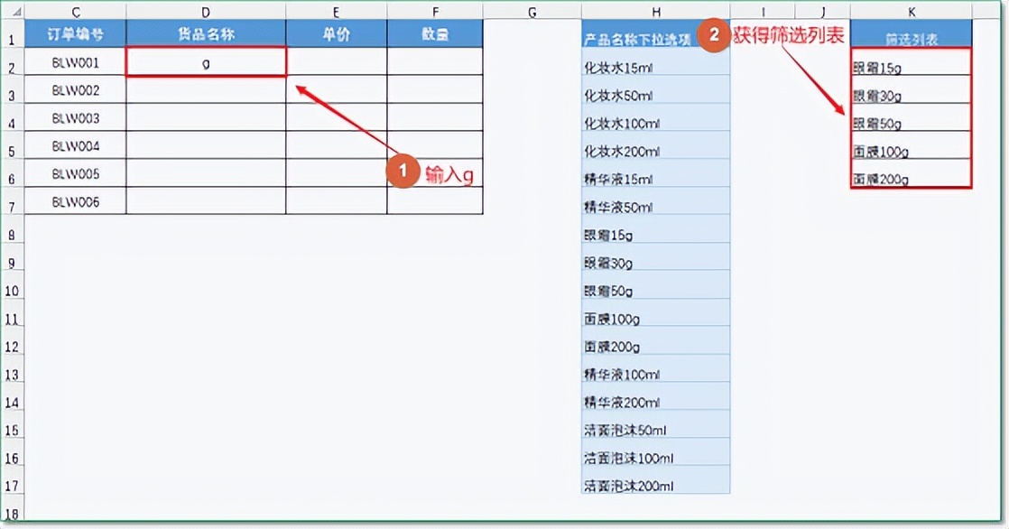 在D2单元格输入关键字的时候,可以通过公式,得到一个筛选列表。