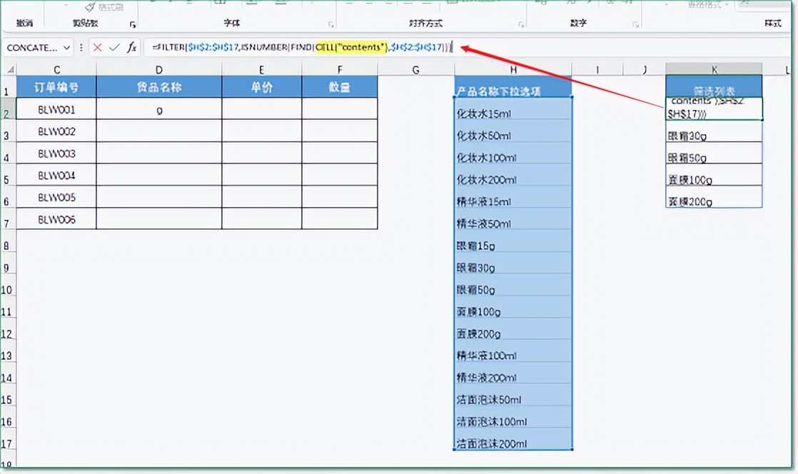 因为filter函数不支持模糊筛选,我们用find函数查找包含有输入值(通过CELL函数获取的值)的单元格。