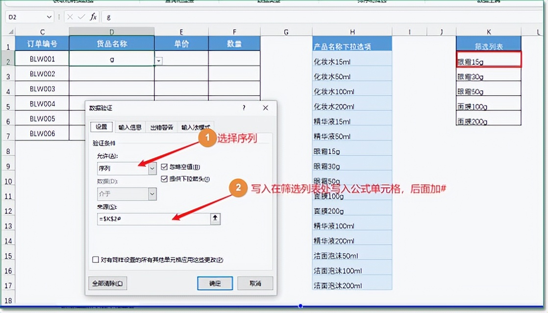 选中D列中想要设置下拉菜单的区域,点击【数据】–【数据验证】,然后在设置选项下处选择【序列】,在来源处,写入【$k$2#】(K2是刚才写入公式的单元格),这样写可以引用筛选的动态区域作为下拉的列表,而不是像我们平时设置普通下拉菜单一样,是选择的固定区域。