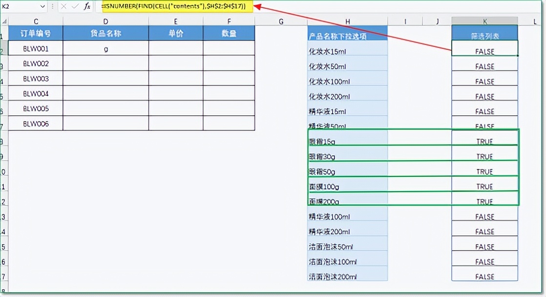 FIND函数,如果找到了输入值,会返回输入值在字符串中的位置;找不到会返回错误值。我们用ISNUMBER函数(判断是否为数字)进行判断,如果返回的是数字,证明包含了输入值,会得到“TRUE”,反之,表示没有包含,会得到“FLASE”。