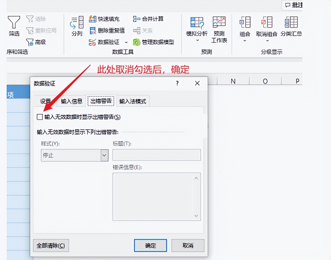 我们需要在【数据验证】–【出错警告】对话框下面,取消勾选【输入无效数据时显示出错警告】选项。